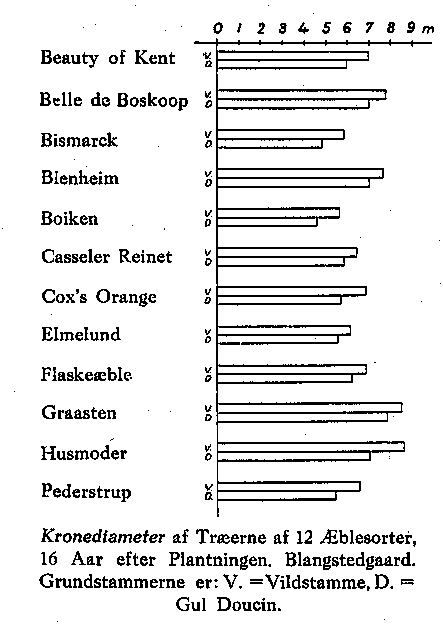 Træet. Størrelsen omtales, men da denne foruden af Træets Alder og den anvendte Grundstamme er i høj Grad afhængig af ydre Kår som Klima, Jordbund, Pasning m. m., må den blive meget variabel. Gennem et stort Antal Målinger af Træer kunde man nå frem til ret sikre Middeltal. For Valget af Planteafstand har Træets Størrelse særlig Betydning. De herom givne Oplysninger må kun opfattes som en Orientering. Hosstående Figur illustrerer den Størrelse, nogle Forsøgstræer af Æble har nået på Blangsted-gård Forsøgsstation igennem 16 år. Man lægger Mærke til Forholdet mellem Vildstamme- og Dværgtræer.