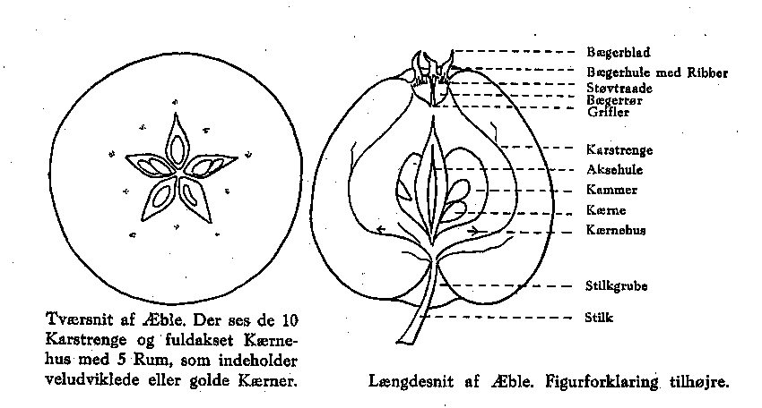Frugten. Der er lagt Vægt på en grundig og klar Beskrivelse af Frugten og dens Egenskaber. Angående de brugte Betegnelser henvises til ovenstående Tegninger af et gennemskåret Æble, der viser Frugtens enkelte Dele.