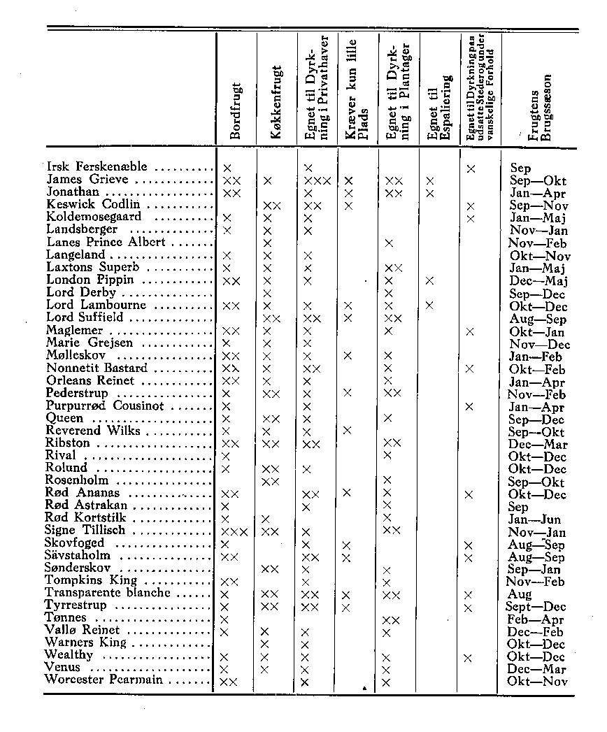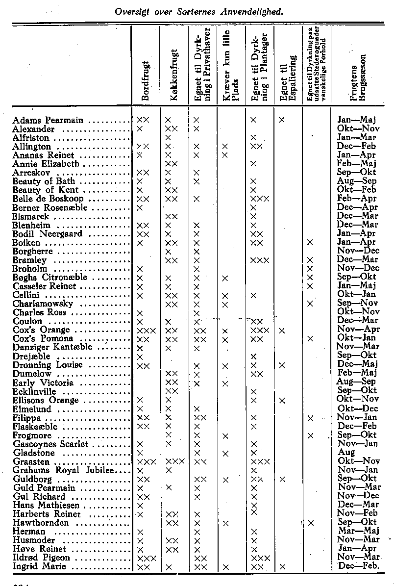 For at give Værkets Brugere en Oversigt over de medtagne Sorter og lette dem Valget mellem disse er nedenstående Skema udarbejdet. Det giver Oplysning om Frugtens Karakter, Sortens Egnethed til forskellige Formål og om Frugtens Brugstid. Ved Anvendelse af et eller flere X er Graden af vedkommende Egenskab søgt belyst. I Kolonnen »Egnet til Dyrkning i Plantager« har 5 Sorter fået 3 Kryds. Disse er formentlig Hovedsorter for Danmark-15 Sorter har 2 Kryds og må også anses for gode Erhvervssorter. Den enkelte Frugtavler vil gøre Udvalg mellem disse 20 Sorter og dertil føje nogle af de med et Kryds mærkede Sorter, som han af en eller anden Grund har Tiltro til.