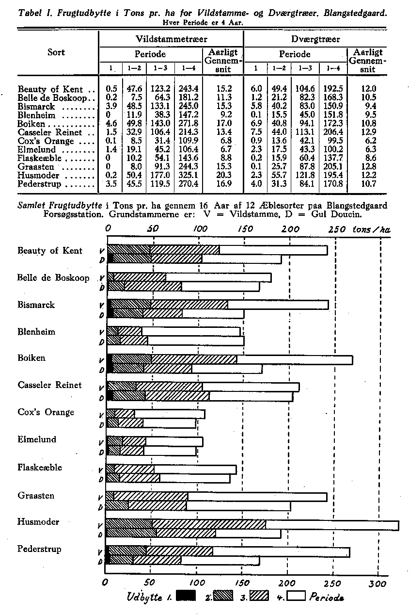 Sorternes Frugtbarhed er angivet ved Udtryk som stor, meget stor o. s. v. Det virkelige Frugtudbytte kan kun oplyses gennem Vejning, og allerbedst gennem langvarige og omhyggeligt gennemførte Sortsforsøg. Sådanne Forsøg blev sat i Gang i 1919 på Blangstedgård Forsøgsstation med 12 Sorter af Vinteræbler. Resultatet for 16-års Perioden 1922—1937 fremgår af nedenstående Tabel, hvor Udbyttet angives i Tons pr. ha efter Perioder å 4 år for såvel Vildstamme- som Dværgtræer. Som det ses, er der meget stor Forskel mellem Sorterne inden for de enkelte Perioder og som Helhed. Den grafiske Fremstilling, der viser det samlede Udbytte ved hver 4-års Periodes Afslutning, understreger yderligere dette. Også Forholdet mellem Vildstamme- og Dværgtræernes Frugtbarhed belyses godt af de anførte Data.