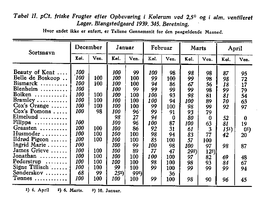 Forhold vedrørende Opbevaring af Æbler er blevet belyst gennem Forsøg på Blangstedgård. Tabel II giver en Oversigt over Resultaterne af et sådant Forsøg. Der er her sammenlignet Opbevaring i Kølerum med Opbevaring; i almindeligt ventileret Lagerrum. Forskellen mellem Kølerum og ventileret Rum kommer især frem i den sidste Halvdel af Perioden. Som det ses, forholder Sorterne sig meget forskelligt. I de senere år er Frugt også blevet-opbevaret i »Gasrum«.