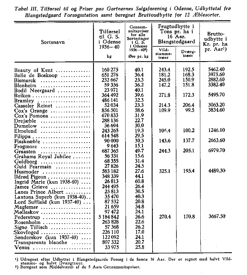 Under Overskriften Dyrkningsværdi er Helhedsindtrykket af Sorten samlet. Man må her skelne mellem Privat- og Erhvervsfrugtavl. I den første er det ikke så meget det økonomiske Resultat som Sortens Trivelighed og Frugtens Brugsværdi, det kommer an på. I Erhvervsfrugtavlen er Spørgsmålet mere af regnskabsmæssig Karakter. I Tabel III er der på Grundlag af de i Odense opnåede Priser og Forsøgsresultaterne fra Blangstedgård udregnet Pengeudbyttet i Kr. pr. ha pr. år. Det er indlysende, at disse Gennemsnitstal ikke kan svare til de af enkelte Frugtavlere opnåede Resultater. Det ses af Tabellens sidste Kolonne, at Bruttoudbyttet svinger fra Kr. 1246.10 (Elmelund) til Kr. 6979.70 (Gråsten). Nettoudbyttet fremkommer, efter at alle Produktions- og Omsætningsudgifter er trukket fra. Da disse Udgifter kan være meget forskellige for Sorterne, kan man ikke af Tabellens Tal fastslå noget endeligt om Sorternes Rentabilitet.