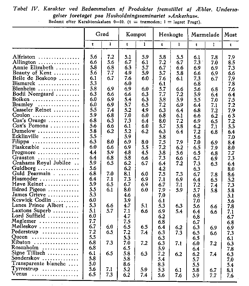 I Erkendelse af, at Frugtens Brugsværdi er en overordentlig vigtig Sag, besluttede Fællesudvalget for Frugtavlsøkonomi at gøre den til Genstand for en særlig Undersøgelse. Denne Undersøgelse blev i årene 1938_39 foretaget på Husholdningsseminariet »Ankerhus« ved Sorø under Ledelse af Seminarielærer Folmer Dam. 42 Æblesorter er indgået i Undersøgelsen, hvis Hovedresultat fremgår af Tabel IV. Frugterne er anvendt til Grød, Kompot, Henkogning, Marmelade og Most. I de fleste Tilfælde er der brugt både træmoden og lagret Frugt. Bedømmelsen er sket skønsmæssigt efter Pointsskalaen O—10. Et nøjere Studium af Tallene viser, at der er en Del Forskel på Sorternes Anvendelighed til forskellige Formål. F. Eks. kan en Sort være udmærket til Mostfremstilling, men mindre god til Henkogning (Guldborg), en anden Sort kan være velanvendelig på mange Måder (Gråsten), medens en tredie kan være temmelig uegnet som Madæble (Ildrød Pigeon). Undersøgelsens Resultat falder ikke i alle Tilfælde helt sammen med den under Omtalen af de enkelte Sorter givne Karakteristik. Denne hviler i høj Grad på Skøn og personlig Opfattelse.