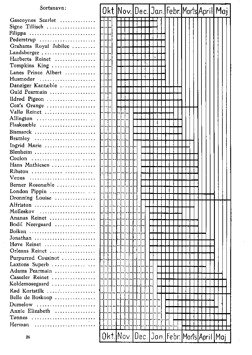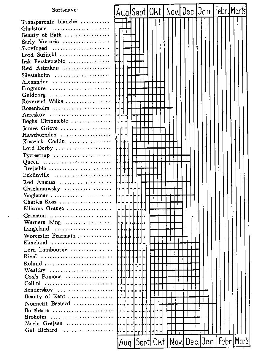 Heller ikke de givne Oplysninger om Frugtens Holdbarhed og Opbevaring må tages for bogstaveligt, da ikke alene Sortsegenskaber, men også Frugtens Tilstand ved Nedplukningen, Opbevaringsrummenes Art og Opbevaringsvilkårene her spiller afgørende ind. De to tabellariske Oversigter over Sorternes Brugssæson skulde tjene til at lette Sortsvalget. Se Tabel V.