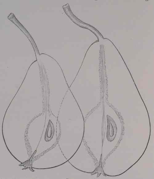Beskrivelse af Frugten. - Størrelse og Form: stor, varierer ofte lidt i Form, er normalt pæreformet men ofte også mere flaskeformet og ved den ene Side lidt indsvejfet hen mod Stilken. — Bæger: åbent, Bladene kanalformede, ligger stjerneformigt udbredte, forbundne med en bred Rand; ingen Hule men Spor af flade Ribber ses. — Stilk: lang, ca. 40 mm, krum, kraftig, olivenbrun, med få Barkporer, tykkere ved Grunden, trykkes lidt til Siden på den afstumpede Frugtspids. —Hud: lysegrøn, senere mere lysegul med grønne Partier og undertiden tyndt rødt i Flammer og Striber på Solsiden; Punkter fine, ret talrige, ses ikke meget, om Stilk og Bæger lys Rust og små Rustfigurer ned over Frugten. — Kærnehus: tenformet, Aksen lukket eller svagt åben, Rum tilliggende, Kærner ret brede men ofte golde. — Bægerrør: en lille Gryde med lang, fin Kanal. —Kød: hvidt med gul Tone, fint, flyder over af Saft, fuldt smeltende, af fin, sød og godt krydret Vinsmag, der minder lidt om Smagen hos Nelis d'hiver. — Modningstid: var 1919 tjenlig sidst i Oktbr. og holdt sig god hele Novbr. 1921 blev den Oktoberpære, 1920 November og lidt ind i December. Ejeren meddeler, at den ofte har holdt sig Jul over. — Værd : udmærket fin Bordpære.