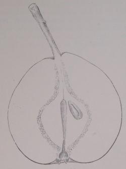 Beskrivelse af Frugten. Størrelse og Form: godt middelstor, rundt topformet, stærkt afplattet ved Bægeret. Bæger: halvlukket eller lukket, Bladene brede, korte, dunede, bøjer indad, sidder i en omtrent middeldyb glat Hule. Stilk: 30-32 mm lang, kraftig, brun med få Barkporer men oftest med en lille Knop op mod Enden; Hulen lille, snæver, en lille Svulst træffes ofte. -- Hud: som moden citrongul uden rødt, tynd; Punkter fine, tætsiddende, ingen eller kun ringe Rust om Stilk og Bæger. -- Kærnehus; Aksen lang, middelvid, Rum stærkt udstående, Kærner lange, smalle, næsten altid golde. Bægerrør: en lille Gryde med lang Kanal. Kød: gulagtigt, groft, temmelig fast, safligt, sødt krydret, bliver hen mod Foråret lidt mere mørt og er så brugelig Bordfrugt, men ellers fortrinlig Kompotfrugt. Modningstid: Marts-April, undertiden længere. Træet er sundt og meget rigtbærende.