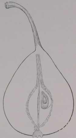 Beskrivelse af Frugten. — Størrelse og Form: lille, ægpæreformet. — Bæger; åbent, Blade korte, brede, forbundne ved en bred Rand, som de kun hæver sig ubetydeligt, ud over, sidder udenpå Frugten uden Hule. — Stilk; lang, tynd, krum, tykkere næst Frugten, lyst olivenbrun med meget fine Barkporer. —Hud: græsgrøn uden rødt, forandrer sig ikke ved Modningen; Punkter meget fine, tynd, ikke sammen? hængende Rust over det meste af Frugten. — Kærnehus: Aksen snæver, undertiden lukket, Rum forholdsvis store, omtrent tilliggende, Kærner mørkebrune uden kendelig Hage. — Rør: en lille Gryde med kort Kanal. — Kød: hvidt, saftigt, halvsmeltende, sødt vinagtigt, godt krydret. — Modningstid : sidste Halvdel af Oktober. — Værd: ret god Spisepære, som kan have Værd for barskere Egne og lette Jordbundsforhold.