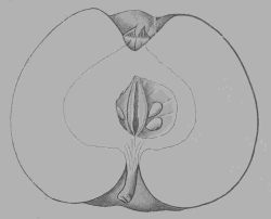 Beskrivelse af Frugten: — Størrelse og Form: stort, rundt eller fladt afstumpet kegleformet, Bugen nærmest til Stilken, lidt mere aftagende mod Bægeret, bredt afstumpet ved begge Ender, den ene Halvdel lidt stærkere udviklet. — Bæger: nærmest lukket, Bladene små, brede, korte, snævrer hurtigt ind til en kort, fin Spids, uldede, bøjer indad men formår slet ikke at dække Røret; Hulen dyb, middelvid til snæver, Ribber på Randen brede, flade, større ned over Frugten, en enkelt er altid lidt mere fremtrædende, når lige ind i Stilkhulen, Tværsnittet svagt kantet; Ribberne er ikke nær så fremtrædende som hos den forméntlige Moderfrugt. — Stilk: kort, tyk, lige, lidt dunet; Hulen middeldyb til dyb, vid med lidt tynd lysebrun Strålerust. — Hud: grønlig gul, solbeskinnede Frugter er tæt overstænkede og stribede af et smukt mørkt karmoisinrødt, Grundfarven skinner dog igennem; Punkter meget få og meget lidt synlige, fine med bred, mat, lidet kendelig Hov. Kraftig Lugt 0g svagt fedtet. — Kærnehus: løghjerteformet, Aksen kort, vid, Rum temmelig store, tilspidsede opad, svagt afrundede nedad, Vægge lidt sprængte, Kærner store, rundt ægformede, trinde, mørkebrune, to i hvert Rum; Rummene åbner sig spalteformigt. — Bægerrør: en lille, kort og bred Kegle, Tråde midtstillede, Griffel dybtkløvet, håret i Delingsstedet. —— Kødet hvidt, saftigt, af kraftig vinsyrlig Smag. — Modningstid: December—Februar ud. — Værd: meget god Husholdningsfrugt og smuk Salgsfrugt.