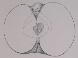 Beskrivelse af Frugten: — Størrelse og Form; nærmest stort, mere eller mindre fladrundt med Bugen lidt under Midten, den ene Halvdel stærkere udviklet. —— Bæger: vidtåbent, Bladene brede, bøjer straks tilbage, er adskilte ved Grunden; Hulen dyb, middelvid, Ribber flade, fortsættes helt ned over Frugten, en enkelt trænger sig oftest frem på de andres Bekostning. — Stilk: snart tynd, snart mere kraftig, altid kort, glat eller svagt dunet; Hulen dyb, vid med 1ysebrun Strålerust. — Hud: som moden lyst strågul, solbeskinnede Frugter med tynd brunrød Solside, hvori mørkere Flammer; Punkter spredte, lysebrune med smal Hov; vorteagtige Rustpletter træffes. Kraftig god Lugt, fedtet. —— Kærnehus: meget Iille, rundt løgformet, stærkt afrundede opad, rundt tilspidsede nedad, Vægge glatte, én but Kærne i hvert. --- Bægerrøret en skarp, stor Kegle, Tråde under midtstillede, Griffel oftest ødelagt. —Kød: hvidt, saftigt, lidt marvet, af kraftig Vinsmag og godt.Aksen lukket, Rum små,— Modningstid: sidst i Oktober, Året ud. — Værd: god Bordfrugt, meget god Husholdningsfrugt, af Værd som Cox's pomona, ikke så smuk men med et meget rundt Træ.