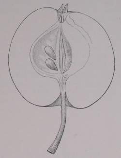 Beskrivelse af Frugten: — Størrelse og Form: lille til middelstort, rundt ægformet, Bugen omtrent på Midten, begge Halvdele ens udviklede. — Bæger: lukket, Bladene brede, tæt filtede, butte, bøjer indad med Spidserne udad; Hulen meget flad eller næsten ingen, Ribber små, men ret markerede, løber flade ned over Frugten, så Tværsnittet er næppe fuldt rundt. — Stilk: kort og tyk eller lang og kraftig, gulbrun, glat, trykkes af en lille, skarp Svulst; Hulen flad, vid, kun med Spor af Rust. — Hud: lyst citrongul, Solsiden har på solbeskinnede Frugter en tynd brunrød Dæks farve uden Stænk eller Striber; Punkter ret talrige uden kendelig Hov, ingen Lugt, svagt fedtet. — Kærnehus: stort, rundt løgformet. Aksen middelvid. Rum store, når helt til Bægerrøret, tilspidsede opad, rundt tilspidsede nedad, Vægge glatte, to store mørkebrune Kærner i hvert. — Bægerrør: en lille grydeagtig Kegle, Tråde under midtstillede. Griffel kortkløvet, glat. - Kød: hvidt, saftigt, vinagtigt, ikke meget kraftigt. — Modningstid: Oktober eller lidt før til noget ind i November. — Værd: brugelig Bordfrugt, har størst Værdi på Grund af Træets Hårdførhed og passer derfor for meget barske Egne.