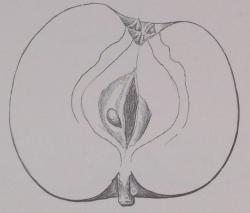 Beskrivelse af Frugten: — Størrelse og Form: middelstort, fladrundt, ligner en Vinter Guld Parmain, Bug på eller lidt under Midten, den ene Halvdel noget kraftigere udviklet. - Bæger: stort, åbent, Bladene brede, korte, svagt dunede, står lige op, er lidt adskilte ved Grunden, kan slet ikke dække Bægerrøret; Ribber ubetydelige, flade, spores dog svagt ned til Bugen; Hulen næppe middeldyb, middelvid. - Stilk: kort, kraftig til tyk, glat; Hulen flad, middelvid med tynd gråbrun, ikke eller kun ringe strålet Rust. — Hud: mørkegul med tynd lakfarvet Dækfarve på Solsiden; Punkter spredte, mørke med smal Hov, nætagtig Rust i Bægerhulen og lidt ned ad Siden. Ingen Lugt og ikke eller kun svagt fedtet. — Kærnehus: lille, eliptisk, Aksen middelvid, det hele lidt uregelmæssigt, Rum smalle, spidst tilspidsede mod begge Ender, Vægge glatte, en tyk lysebrun Kærne i hvert. — Bægerrør: en kort, bred, lidt tragtagtig Kegle, Tråde dybtstillede, Griffel 1/3 kløvet, glat. — Kød: svagt gult, middelsaftigt, lidt syrlig reinetagtigt, minder meget om Vinter Guld Parmain, som Sorten godt kan træde i Stedet for. — Modningstid: Vinter. — Værd: er en smuk og god Guldreinet.