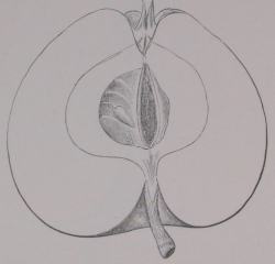 Beskrivelse af Frugten. — Størrelse og Form: middelstort, rundt kegleformet, Bugen under Midten, noget aftagende derfra mod Bægeret, begge Halvdele ens udviklede. — Bæger: lukket eller halvåbent, Bladene korte, bøjer indad, står lige op, er glatte; Hulen middeldyb, snæver, Ribber indenfor Randen forholdsvis store og ret markerede, er borte på Randen, men spores svagt ned over Frugten, så Tværsnittet er næppe fuldt rundt. - Stilk: middellang, kraftig til tyk, fint dunet; Hulen dyb, vid med lidt tynd Strålerust. — Hud: lyst citrongul med grøn Tone, ringe Spor af Striber og Stænk træffes på Solsiden; Punkter spredte, mørke med smal Hov. Svag Lugt og svagt fedtet. — Kærnehus: rundt løgformet, Aksen middelvid, lang, Rum tilspidsede opad, rundt tilspidsede nedad, Vægge sprængte, en eller to store tykke Kærner i hvert. — Bægerrør: en Kegle, Tråde midtstlllede, Griffel 2¦3 kløvet, fint håret på den sammenvoksede Del. — Kød: hvidt, tæt, meget saftigt, vinsyrligt uden kendelig Sødme. — Modningstid: November til hen på Vinteren. — Værd: god Torvefrugt, fortrinlig Kogefrugt, koger let ud. Er bedre Husholdningsfrugt end Hanthornden og Opmærksomhed værd.