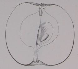 Beskrivelse af Frugten: — Størrelse og Form: lille til middelstort, Bug omtrent på Midten, stærkt afplattet ved begge Ender, de to Halvdele ens udviklede. — Bæger: lukket, Blade lidt dunede, brede, korte, bøjer indad og dækker Røret; Hulen flad, vid eller også ingen, Ribber meget små, flade, enkelte spores dog ned over Frugten; Tværsnit rundt. — Stilk: en Knort; Hulen flad, vid med Spor af Rust. — Hud: lysegul, men ses ikke ren, hele Frugten er l dækket af et smukt karmoisinrødt, hvori korte Striber; kun enkelte Punkter træffes, mørke med smal Hov. God Lugt og svagt fedtet.— Kærnehus: forholdsvis stort, rundt, Aksen snæver. Rum store, lidt afrundede opad, rundt tilspidsede nedad, Vægge lidt årede, en temmelig stor, lysebrun Kærne i hvert. — Bægerrør: en Tragt, Tråde højtstillede, Griffel 2/3 kløvet, håret på midterste Tredjedel. — Kød: hvidt, lidt rødligt under Huden næst Bægeret, saftigt, fast, lidt syrligt vinagtigt, dog med fornøden Sødme og godt. — Modningstid: var tjenligt midt i November og skal kunne holde sig længe. — Værd: ret god Bordfrugt og meget god til al anden Brug, meget smuk Juletræsfrugt.