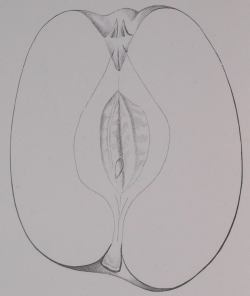 Beskrivelse af Frugten. — Størrelse og Form: stort til meget stort, ca. 88 mm bredt, 96 mm højt men varierer i Form, er snart og vist oftest valseformet, snart mere rundt afstumpet kegleformet, de fleste af de sendte Frugter havde Form som Fig. Bug hen imod Stilken, den ene Halvdel stærkere udviklet. — Bæger; lukket, Bladene grønne, fint uldede, bøjer indad, står lige op, støder næppe sammen ved Grunden; Hulen dyb, snæver, Ribber ulige store, indenfor Randen små, større ned over Frugten; Tværsnit meget kantet. — Stilk: en kort, tyk Knort; Hulen flad til middeldyb, vid med lidt lysebrun Strålerust i Bunden, trykkes af en stor Svulst. — Hud: smuk lysegul, Solsiden og ofte mere er fuld af et smukt mørkt rosenrødt i Stænk og lange Striber; Punkter talrige, meget fine, lysebrune med smal Hov. Stærkt fedtet. — Kærnehus: åbent som hos Nonestitte Vægge sprængte og stærkt filtede, Kærner få, små, trinde. — Bægerrør : en dyb afrundet Kegle, Tråde midtstillede, Griffel halvkløvet, fint håret, meget tynd. —Kød: hvidt, saftigt, lidt groft, bliver hurtigt brunt efter Snittet, vinsyrligt uden Aroma. — Modningstid: Oktober - Året ud eller lidt længere. — Værd: er en glimrende smuk Handelsfrugt og meget god Husholdningsfrugt.