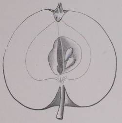 Beskrivelse af Frugten. — Størrelse og Form: lille, rundt kegleformet, bredere end højt, Bug under Midten, begge Halvdele éns udviklede. — Bæger: lille, lukket, Bladene grønne, glatte, bøjer indad og lukker omtrent tæt over Bægerrøret, er lidt adskilte ved Grunden; Hulen flad, snæver, Ribber små, dog ret markerede i Hulen, taber sig hurtigt, så Tværsnittet er rundt. — Stilk; kort, kraftig, glat; Hulen dyb, vid med lysebrun Strålerust. —Hud: strågul, Solsiden med mørk rosenrød Dækfarve, fuld af fine Stænk og små korte Striber, dog skinner Grundfarven igennem; Punkter få, fine med smal Hov; lidt fin Rust træffes, især næst Bægeret. Kraftig Lugt og fedtet. — Kærnehus: svagt betegnet, rundt løgformet, Aksen middelvid, åbner sig spatelformigt. Rum store, rundt tilspidsede mod begge Ender eller svagt rundet opad, Vægge glatte, to store kastaniebrune Kærner i hvert. — Bægerrør: en lille grydeagtig Kegle, Tråde midtstillede, Griffel kortkløvet, glat. — Kød: hvidt med gul Tone, saftigt, sødt vinagtigt med god Aroma. — Modningstid: Oktober-November. — Værd: meget smuk lille Frugt og god Bordfrugt.