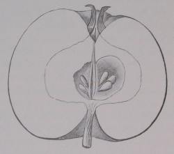 Beskrivelse af Frugten. — Størrelse og Form: lille til næppe middelstort, fladrundt, Bugen på eller lidt under Midten, den ene Halvdel stærkere udviklet. — Bæger: forholdsvis stort, åbent, Bladene smalle, står lige op med tilbagebojede Spidser, er fint dunede og adskilte ved Grunden; Hulen middelvid til snæver, middeldyb, Ribber brede, bløde, lidt fremstående, spores dog ned over Frugten og kanter Tværsnittet svagt. — Stilk: kort til middellang, kraftig, mørkebrun, lige eller svagt bøjet; Hulen middeldyb til dyb, middelvid med ubetydelig Strålerust. —Hud: mørkegul med varmere Solside og her små fine, korte, smalle, mørkt rosenrøde Striber og Stænk; Punkter få, store, mørke uden kendelig Hov. Kraftig fin Lugt og fedtet. —Kærnehus: bredt løghjerteformet. Aksen middelvid, Rum brede, afrundede opad, rundt tilspidsede nedad, Vægge glatte, 3—4 sortebrune veludviklede Kærner i hvert. — Bægerrør: en bred Kegle, Tråde midtstillede. Griffel lidt over halvkløvet, filtet på den kløvede Del. — K ø d: udpræget gult, marvet, saftigt, godt krydret sødt vinagtigt, meget velsmagende, et af de bedste jyske Frøæbler. — Modningstid: »Æblet sidder lidt løst på Træet men kan plukkes først i September og kan da spises men også gemmes til Jul.« — Værd: fin og meget god Bord- og let sælgelig Salgsfrugt