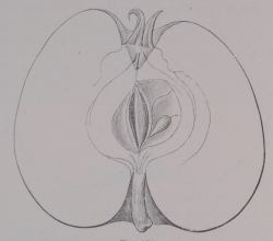 Beskrivelse af Frugten. — Størrelse og Form: godt middelstort, ca. 78 mm. bredt, 66 mm. højt, afstumpet kegleformet, Bug hen mod Stilken, den ene Halvdel lidt stærkere udviklet. —Bæger: halvåbent, Bladene brede, lange, grønne, bøjer indad, krøller Spidserne udad; Hulen dyb, middelvid, Ribber flade, mere fremtrædende ned over Frugten; Tværsnit kantet. — Stilk: næppe middellang, næsten tyk, glat; Hulen dyb, snæver med lidt fin Strålerust. —Hud: grønliggul, Spor af røde Striber på Solsiden; Punkter spredte, mørke med smal Hov, nærmest Stilken kommaformede. Stærkt fedtet. — Kærnehus: lille, Aksen kort, vid, Rum but tilspidsede opad, rundt tilspidsede nedad, Vægge lidt sprængte, én trind, lysebrun Kærne i hvert. — Bægerrør: en Kegle, Tråde under midtstillede. Griffel dybtkløvet, glat. — Kød: hvidt, meget saftigt, mørt, honningsødt. —Modningstid:. Oktober-November. — Værd: som Sødæbler fortræffeligt, for Yndere af sådanne.