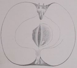 Beskrivelse af Frugten. Størrelse og Form: stort, l bedste Udvikling 90 mm. bredt, 75 mm. højt, oftest vel en Kende mindre, afplattet rundt eller afstumpet kegleformet, Bugen under Midten, begge Halvdele éns udviklede. B æ g e r : åbent, Bladene korte, brede, butte, fint uldede, står lige op, er vidt adskilte ved Grunden; Hulen dyb eller godt middeldyb snæver, Ribber flade, kendes først ned over Frugten. Stilk: kort, tyk, næsten en Knort; Hulen flad, vid, enkeltvis med en lille Svulst, ingen, eller kun ringe Spor af Rust i Bunden.Hud: strågul, tæt stribet og stænket af det smukkeste rosenrøde, som helt kan dække Solsiden; Punkter meget fine, dog også få større, alle uden Hov. Svag Lugt og fedtet. Kærnehus: stort i Omkreds, bredt løgformet, Aksen snæver til middelvid, Rum store, afrundede opad, rundt tilspidsede nedad. Vægge årede, undertiden lidt sprængte, Kærner rundt ægformede, violetbrune, én i hvert Rum. Bægerrør: en stor tragtagtig Kegle, Tråde midtstillede, Griffel dybtkløvet, filtet over det hele. Kød: hvidt, Årer rødlige og Kødet rødligt, udenfor disse, saftfuldt, af kraftig sød, krydret Vinsmag med fin Syre.-- Modningstid: November-December eller noget ind i det nye År Værd: meget god Bordfrugt og overmåde smuk Salgs- og Pyntefrugt.