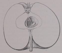 Beskrivelse af Frugten: — Størrelse og Form: næppe middelstor, kort afstumpet kegleformet, Bugen under Midten, den ene Halvdel stærkere udviklet, ligner en lille Cor's pomona. — Bæger: stort, lukket eller halvåbent, Bladene fnuggede, bøjer indad og opad; Hulen forholdsvis dyb, snæver, Ribber ret markerede, ulige store, spores blødt ned over Frugten, Tværsnit kantet. — Stilk: middellang, ret kraftig, glat; Hulen dyb, vid med ringe eller ingen Rust, ofte med en lille Svulst. — Hud: hvidlig grønliggul, senere gul, Solsiden med smuk blodrød Dækfarve fuld af Striber og Flammer; Punkter få med klar Hov. Svag Lugt, men stærkt fedtet. — Kærnehus: lille, højtsiddende, fladt løghjerteformet, Aksen kort, vid, Rum små, but afrundet mod begge Ender, Vægge glatte, én stor Kærne i hvert. — Bægerrør: en Gryde, Tråde midtstillede, Griffel halvkløvet, håret i Delingsstedet. — Kød: hvidt, meget saftigt, vinagtigt, overvejende sødt, godt krydret. Modningstid: sidst i November til noget hen på Vinteren. Værd: meget god Bordfrugt.