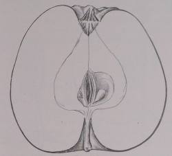 Beskrivelse af Frugten: - Størrelse og Form: godt middelstort, afstumpet kegleformet eller også mere rundt, begge Halvdele er enten lige udviklet eller den ene lidt stærkere, Bugen under Midten. — Bæger: stort, lukket eller halvåbent, Bladene brede, butte, tæt uldede, bøjer indad eller udad eller står lige op, er lidt adskilte ved Grunden; Hulen er næsten dyb, snæver eller næppe middelvid, Ribber små, l Hulen dog tilligemed Biribberne ret markerede, spores svagt ned over Frugten, dog er Tværsnittet omtrent fuldt rundt. -- Stilk: kort, kraftig, ofte en Knort, dunet; Hulen dyb, snæver med lidt grå Strålerust. — Hud: varmt gul, Solsiden med tynd, rød Dækfarve, hvori Striber og i Udkanten Stænk; Punkter spredte, fine, mørke med klar Hov. Svag Lugt og stærkt fedtet. — Kærnehus: smalt løgformet, svagt betegnet, Aksen kort, dybtsiddende, Rum små, lidt udrandede opad, rundt tilspidsede nedad, Vægge glatte, en blåbrun Kærne i hvert. — Bægerrør: en bred, stor Kegle, Tråde midtstillede. Griffel 2/3 kløvet, tæt håret på den sammenvoksede Del. — Kød: hvidt med gul Tone, saftigt, lidt fast, dog mørt, sødt vinagtigt, godt krydret. — Modningstid: Jul til langt ud på Foråret. — Værd: god Bordfrugt og meget smuk Salgsfrugt til Julemarkedet. Dette gode og meget smukke Æble synes at være megen Opmærksomhed værd.