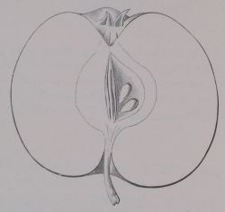 Beskrivelse af Frugten: - Størrelse og Form: middelstort, fladrundt, Bugen på Midten, den ene Halvdel lidt kraftigere udviklet. - Bæger: åbent. Bladene brede, bøjer lidt indad, og derpå udad, er butte, glatte, lidt adskilte ved Grunden; Hulen er en middeldyb Skål, Ribber små, flade, taber sig hurtigt, Tværsnit rundt. — Stilk: kort eller middellang, krum; Hulen snæver, dyb med grov, brun, ikke strålet Rust. — Hud: mørk, mat, lidt smudsig gul, omtrent helt dækket af et mørkt blodrødt uden Striber eller Stænk; Punkter talrige, store, lysebrune uden Hov. Nogen Lugt og lidt fedtet. — Kærnehus: lille, ovalt., Aksen middelvid, Rum små, tilspidsede opad, rundt eller but tilspidsede nedad, Vægge lidt sprængte, 2 trinde, ægformede Kærner i hvert. — Bægerrør: en lille Kegle, undertiden lidt tragtagtig, Tråde midtstillede, Griffel kortkløvet, glat. — Kød: snehvidt, saftigt, lidt tæt, af krydret, lidt vinsyrlig god Smag. — Modningstid: September-Oktober. — Værd: god og smuk Bordfrugt og meget god Køkken- og Salgsfrugt.