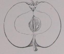 Beskrivelse af Frugten: — Størrelse og Form: lille, fladrundt, Bugen på eller lidt under Midten, begge Halvdele ens udviklede. -- Bæger: halv- eller helt åbent, Bladene brede, korte, bøjer indad, opad og Spidserne udad; Hulen flad, Ribber små, dog lidt kendelige som brede ned over Frugten, en enkelt er ofte forsynet med en fin, skarp Søm lige fra Bæger til Stilk; Tværsnit næppe fuldt rundt. — Stilk: kort, kraftig, rødbrun, dunet; Hulen middeldyb til dyb, vid, kun med Spor af Rust i Bunden. — Hud: lyst strågul, omtrent helt dækket af et skinnende kirsebærrødt, fuldt af lysere Flammer; Punkter få, fine med bred Hov, ses ikke meget. God Lugt, svagt fedtet. — Kærnehus: stort i Omkreds, ellers lille, fladt løgformet, Aksen middelvid, Rum små, rundt, lidt udrandet tilspidsede opad, rundt tilspidsede nedad, Vægge glatte, én lille, rundt ægformet Kærne i hvert. — Bægerrør: en lille skarp Kegle, Tråde midt- eller lidt over midtstillede, Griffel dybtkløvet, fint håret over det hele. — Kød: hvidt, lidt rødligt næst Huden, tæt, saftigt, sødt vinagtigt med bæragtig Aroma og velsmagende. — Modningstid: December-Februar. — Værd: meget god lille Bordfrugt og glimrende Pyntefrugt, ret et Juletræsæble.