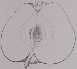 Beskrivelse af Frugten: — Størrelse og Form: stort, ca. 85 mm bredt, 69 mm højt, afstumpet kegleformet, Bug hen mod Stilkenden, bredt afstumpet mod Bægeret, begge Halvdele ens udviklede. - Bæger: stort, lukket, Bladene smalle, uldede, bøjer indad, slår Spidserne tilbage, er vidt adskilte ved Grunden; Hulen middeldyb, middelvid, Ribber flade på Randen, fremtrædende ned over Frugten og lige ind i Stilkhulen; Tværsnit femkantet. — Stilk: middellang, kraftig til tyk, glat; Hulen middelvid, dyb med ubetydelig Rust. —Hud: strågul, Solsiden stænket og stribet af et mørkt rosenrødt; Punkter spredte, fine med mat Hov. Svag Lugt. — Kærnehus: højt løghjerteformet, Aksen godt middelvid, Rum små, tilspidsede opad, rundt eller but tilspidsede nedad, Vægge glatte, én kort, bred. mørkebrun Kærne i hvert. —Bægerrør: en bred, kort Kegle, Tråde dybstillede, Griffel dybtkløvet, glat. — Kød: hvidt, marvet, saftigt, vinagtigt, minder lidt om Cox's pomona, men er lidt syrligere og med ejendommelig bæragtig Aroma. — Modningstid: November, December. —Værd: god Bordfrugt, smuk Handelsfrugt og meget god Køkkenfrugt.