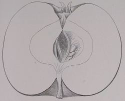 Beskrivelse af Frugten: — Størrelse og Form: middelstort til stort, smukt fladrundt, Bugen under Midten, den ene Halvdel er stærkere udviklet. Bæger: halvlukket, Bladene fint dunede, bøjer indad, opad og udad; Hulen er flad eller middeldyb, Ribber i og på Randen ubetydelige, ned over Frugten brede, ulige store, Tværsnit kantet. -- Stilk: kort, tyk, enkeltvis længere, glat eller svagt dunet; Hulen middeldyb, normalt vid, undertiden kun middelvid med brun Strålerust. -- Hud: lysegul, Solsiden med mere eller mindre mørk rosenrød Dækfarve, fuld af Flammer, Stænk og korte Striber; Punkter spredte, brune med smal Hov; større og mindre Rustfigurer træffes på de fleste Frugter. Svag Lugt og stærkt fedtet. — Kærnehus: fladt løgformet, Aksen vid, når tæt op til Roret, Rum rundt tilspidsede opad, tilspidsede nedad, Vægge sprængte, indtil 3 små mørkebrune Kærner i hvert. — Bægerrør: en skarp tilspidset Kegle, Tråde midtstillede, Griffel dybtkløvet, tæt filtet over det hele. — Kød: hvidt, bliver hurtig lidt brunt efter Snittet, saftigt, syrligt uden Sødme. — Modningstid: November til langt hen på Vinteren. — Værd: meget smuk Salgsfrugt og meget god Husholdningsfrugt.