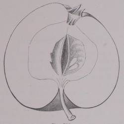 Beskrivelse af Frugten. — Størrelse og Form; lille til middelstort, 65 mm. bredt 58-60 mm. højt, lidt fladt kugleformet, lidt tilsneddet mod Bægeret, den ene Halvdel stærkere udviklet. Bugen noget nær på Midten. — Bæger: lukket, Bladene brede, lange, butte, grønne, glatte ; Hulen forsvindende flad, Ribber meget uregelmæssige, næst Bægeret perleformede, løber tilligemed Biribberne ret udprægede ned over Frugten lige til Stilkhulen og kanter Tværsnittet. — Stilk: middellang til lang, krum, tynd, ollvenbrun, glat; Hulen dyb, vid med fin gråbrun Strålerust. - Hud: lyst guldgul eller hvidlig gul, rødt træffes ikke; Punkter lysebrune, store og små imellem hinanden, ofte talrige, ofte også lidet kendelige, uden synlig Hov. Kraftig Lugt og stærkt fedtet. Vorteagtige Rustfigurer træffes. - Kærnehus: stort i Omkreds, rundt løgformet, Aksen lang, middelvid til vid, Rum lidt udrandet tilspidsede opad, rundt tilspidsede nedad, Vægge svagt sprængte, Kærner små, trinde, lysebrune. - Bægerrør: en bredt afstumpet Kegle, Tråde dybtstillede, Griffel meget kortkløvet, glat. — Kød: hvidt, meget saftfuldt, marvet eller løst, af god, fin, lidt svag Gråstenersmag. — Modningstid: sidste Halvdel af September—Oktober. — Værd: fin og god Bordfrugt.