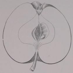 Beskrivelse af Frugten. - Størrelse og Form: middelstort, rundt ægformet eller fladrundt, Bugen på eller under Midten, den ene Halvdel lidt stærkere udviklet; begge Former forekommer nok omtrent lige hyppigt. -- Bæger: stort, halvåbent, Blade brede, lange, dunede, bøjer indad, opad, slår Spidserne tilbage; Hulen flad til middeldyb; Ribber på de ægformede er ret markerede på Randen og kendelige helt ned over Frugten og kantede Tværsnittet, på de fladrunde meget små og da med rundt Tværsnit. -- Stilk: middellang, tyk. glat; Hulen middeldyb til dyb, ofte med en lille Svulst og kun med Spor af Rust i Bunden. -- Hud: mørkegul skinnende, omtrent hele Frugten er tæt stribet og stænket af et smukt karmoisinrødt, som ofte dækker på største Delen af Frugten; Punkter spredte, fine med bred Hov, ses ikke meget; enkelte Rustpletter træffes. God Lugt, svagt fedtet. — Kærnehus: løghjerteformet, Aksen middelvid til vid, Rum afrundede opad, tilspidsede nedad, Vægge sprængte, Kærner rundt ægformede, lysebrune, trinde, få. — Bægerrør: en lille Kegle, Tråde midtstillede. Griffel halvkløvet, tæt filtet under, håret over Delingsstedet. — Kød: hvidt med gul Tone, bliver hurtig gulbrunt efter Snittet, saftigt, vinsyrligt. — Modningstid: Nytår-Forår. — Værd: meget god sildig Husholdnings- og Salgsfrugt. — Der er næppe Tvivl om, at Frugten vil blive adskilligt større på unge og yngere Træer. Fortjener at prøves.