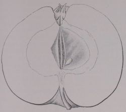 Beskrivelse af Frugten. — Størrelse og Form: stort, 80-84 mm bredt, 68—70 mm højt, fladrundt, dog lidt mere tilspidset mod Bægeret, Bugen omtrent på Midten, den ene Halvdel stærkere udviklet. — Bæger: halvåbent eller åbent, Bladene står omtrent lige op, er adskilte ved Grunden, Hulen middeldyb, snæver, Ribber indenfor Randen store, ned over Frugten brede, når lige ind i Stilkhulen, Tværsnit kantet. --Stilk: kort eller middellang, ret kraftig, lidt krum, glat, middeldyb, vid med brun Strålerust. -- Hud: hvidliggul med grøn Tone, lidt tynd rød Dækfarve på Solsiden ; Punkter talrige, fine med smal Hov. — Kraftig Lugt, svagt fedtet. -- Kærnehus: stort, løghjerteformet, Aksen middelvid, når lige op til Røret, Rum store, rundt tilspidsede opad, but tilspidsede nedad, én lille Kærne i hvert. — Bægerrør: en lidt tragtagtig Kegle, Tråde midtstillede, Griffel kløvet lige til Grunden, fint håret. — Kød: hvidt, marvet og meget løst, saftigt, syrligt med lidt Sødme uden Aroma. — Modningstid: September eller lidt tidligere. — Værd: fortrinlig Køkkenfrugt, som let koger ud, og god Torvefrugt. Af Værd omtrent som Lord Suffield.