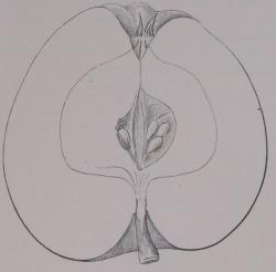 Frugt fra Ørregårds Have, sendt af Hr. Brostrøm. Er et Frøæble. »Træet har en uregelmæssig Vækst og meget store Blade, det har en meget uheldig Plads i Havens Skel mellem Lætræer og Buskvækster.«
