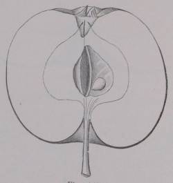 Beskrivelse af Frugten: -Størrelse og Form: lille, fladrundt, men højere end Bakkeæblet, Bugen under Midten, den ene Halvdel lidt stærkere udviklet. - Bæger: stort, halvåbent eller næsten lukket, Bladene brede, bøjer indad, er fint dunede; Hulen flad, vid. Ribber fine, indenfor Randen rynkeagtige, undertiden perlede, spores kun svagt til Bugen, Tværsnit rundt. — Stilk: middellang, tynd, glat; Hulen dyb, middelvid med brun, grov, svagt strålet Rust. — Hud: mørkegul, Solsiden og ofte mere er stænket, stribet, ofte dækket af et smukt karmoisinrødt, Punkter talrige, fine og grove mellem hinanden, mørkebrune med bred Hov, i det røde lysebrune uden Hov; andre Rustfigurer træffes. Ret kraftig Lugt og fedtet. — Kærnehus; løghjerteformet, Aksen vid, Rum små, tilspidsede opad, but tilspidsede nedad, Vægge sprængte, én eller to runde Kærner i hvert. — Bægerrør: en Kegle, Tråde midtstillede. Griffel 2/3 kløvet, tæt håret på den kløvede Del. — Kød: hvidt, saftigt, af kraftig vinsyrlig, dog lidt krydret Smag. — Modningstid: Oktober. — Værd: brugelig Bordfrugt, meget god Husholdnings- og Salgsfrugt.