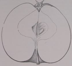 Beskrivelse af Frugten. Størrelse og Form: mere end middelstort, næsten rundt, Bugen lidt under Midten, smukt rundende mod Stilken, ubetydeligt aftagende mod Bægeret, begge Halvdele omtrent ens udviklede. Bæger: lukket eller halvåbent, Bladene store, brede, lange, dunede eller melede, bøjer indad og udad; Hulen flad, vid, Ribber små men skarpt markerede, taber sig ved Bugen, så Tværs snittet er rundt. Stilk: middellang, kraftig, dunet; Hulen dyb, snæver med lysebrun Strålerust. -- Hud: varmt gul, største Delen er dækket af et smukt, skinnende karmoisinrødt, hvori mørkere, kort afbrudte Striber; Punkter talrige, store, mørke med mat Hov. Svag Lugt og fedtet. -- Kærnehus: rundt løgformet, Aksen kort. snæver, Rum afrundede opad, tilspidsede nedad, Vægge årede, én stor Kærne i hvert. Bægerrør: en lille Kegle, Tråde midtstillede, Griffel næppe halvkløvet, håret i Delingsstedet. -- Kød: hvidt med grønlige Årer, saftigt, marvet, vinagtigt uden kendelig Aroma. -Modningstid: December til hen mod Foråret. Værd: brugelig Bordfrugt, god Køkkenfrugt, har mest Værd som glimrende smuk Pynte- og Salgsfrugt.