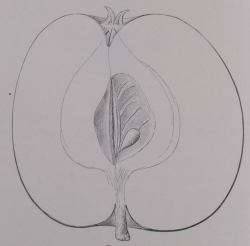 Beskrivelse af Frugten. — Størrelse og Form: godt middelstort, rundt kegleformet eller næsten rundt, afstumpet ved Bægeret, Bug under Midten, rundende smukt mod Stilken, lidt mere aftagende mod Bægeret, den ene Halvdel ofte meget stærkere udviklet. — Bæger: halvåbent. Bladene uldede, bøjer indad, krøller Spidserne tilbage, uldede; Hulen en flad Skål, Ribber fine, spores kun svagt ned over Frugten, Tværsnit omtrent rundt. — Stilk: kort, næsten tyk; Hulen flad til middeldyb, snæver, fuld af grov, mørkebrun, langt udflydende Rust. — Hud: varmt gul, Solsiden med tyndt, smukt rødt i Striber og Stænk; Punkter få eller spredte med fin Hov; Rustfigurer kan træffes. Kraftig Lugt og fedtet. — Kærnehus: ovalt i Omkreds, Aksen snæver eller middelvid, lang, Rum store, tilspidset afrundede opad, rundt tilspidsede nedad, Vægge sprængte, én stor, bred, skarpt tilspidset Kærne i hvert. -- Bægerrør: en Kegle, Tråde midtstillede, Griffel dybtkløvet, tæt håret over det hele. —Kød: hvidt med gul Tone, af sød, stærkt krydret vinagtig Smag. —Modningstid : Oktober til Jul. -Værd: fin Bordfrugt, meget god Salgsfrugt.
