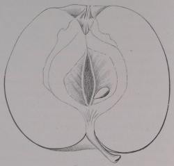 Beskrivelse af Frugten. — Størrelse og Form: middelstort, næsten rundt eller rundt kegleformet, Bugen lidt under Midten, begge Halvdele éns udviklede. -- Bæger: lille, lukket, Bladene grønne, dunede, bøjer indad, slutter ved Grunden; Hulen næppe middeldyb, middelvid, Ribber ubetydelige, dog er Tværsnittet ikke fuldt rundt. — Stilk: kort eller næppe middellang, tykkere næst Frugten, brun, svagt dunet; Hulen næppe middeldyb, vid med ingen eller ringe Rust; er undertiden fyldt af en Svulst. — Hud: mat citrongul med grønt Skær, Solsiden med tynd teglstensrød Dækfarve uden Stænk eller Striber; Punkter talrige, ofte store og kantede, med smal Hov, mindende om Canada Reinetten i Farve; Rustfigurer træffes. Kraftig Lugt og fedtet. — Kærnehus: lille i Omkreds med kraftige Biårer, Aksen vid og lang, Rum forholdsvis store, rundt tilspidsede mod begge Ender, Vægge fint sprængte, få lysebrune, brede Kærner. — Bægerrør: en Kegle, Tråde dybtsiddende, Griffel halvkløvet, filtet eller håret i Delingsstedet. — Kød: grønlig gult med kraftige gulgrønne Årer og Biårer, lidt tæt, saftigt, honningsødt vinagtigt, ejendommeligt, men meget behageligt krydret. -Modningstid: Oktober-November. --Værd: meget god Bordfrugt og Salgsfrugt. Fig. 479. Skovgaardæble.
