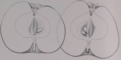 Beskrivelse af Frugten: — Størrelse og Form: middelstort, er højere eller lavere afstumpet kegleformet, undertiden næsten fladrundt, Bugen under Midten, den ene Halvdel stærkere udviklet. — Bæger: åbent, Bladene grønne, svagt dunede, bøjer indad, udad, så de butte Spidser ligger fladt tilbage; Hulen flad eller næppe middeldyb, Ribber små, flade, spores svagt ned over Frugten uden dog at ødelægge Tværsnittets Runding videre. — Stilk: meget kort eller kun en lille Knort; Hulen middeldyb, vid, fuld af lys gråbrun, ikke meget strålet Rust, hvoraf en enkelt Stråle ofte løber langt op over Frugten. — H u d: smuk lyst citrongul, Solsiden med tynd, mat mørkerød Dækfarve, som lader Grundfarven skinne igennem, og hvori skimtes korte Striber; Punkter spredte, lysebrune med bred, svag Hov, ligger fordybede, ses ikke meget. God Lugt og svagt fedtet. — Kærnehus: løghjerteformet, Aksen middelvid, Rum tilspidsede opad, but tilspidsede nedad, Vægge årede, 1-2 store lysebrune Kærner i hvert. — Bægerrør: en tragtagtig Kegle, Tråde over midtstillede, Griffel dybtkløvet, håret i Delingsstedet. — Kød: hvidt, middelsaftigt, lidt marvet, syrligt vinagtigt. — Modningstid: November til noget hen på Vinteren. — Værd: smuk Torvefrugt og fortrinlig Køkkenfrugt.