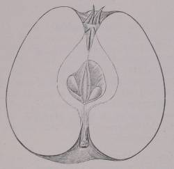 Beskrivelse af Frugten. - Størrelse og Form: lille til middelstort, kegleformet, Bugen nær Stilken, stærkt aftagende hen mod Bægeret, den ene Halvdel lidt stærkere udviklet. — Bæger: lukket, Bladene brede, svagt uldede, står omtrent lige op men slutter ved Spidserne; Hulen middeldyb, middelvid, Ribber små, enkeltvis temmelig markerede, spores svagt ned over Frugten, Tværsnit omtrent rundt. — Stilk: kort, kraftig, ofte også en Knort; Hulen middeldyb, til dyb, middelvid med lidt mørkebrun Rust i Bunden. —Hud: gulgrøn, største Delen omtrent dækket ar et mørkt blodrødt, hvori svagt fremtrædende Flammer og Striber, mod Udkanten Stænk og Striber; Punkter spredte, fine med smal Hov. God Lugt og stærkt fedtet. — Kærnehus: højt og smalt løgformet. Aksen næppe middelvid, kort, Rum små, lukkede, rundt tilspidsede opad, næsten but tilspidsede nedad. Vægge årede, Kærner store, brede, lysebrune. — Bægerrør: en dyb, smal Kegle, Tråde over midtstillede. Griffel dybtkløvet, tæt håret over det hele. —Kød: hvidt med grønne Årer, fast, saftigt, syrligt: — Modningstid: November til Forår. - Værd: meget god Husholdningsfrugt.