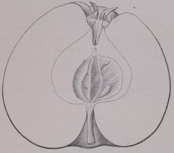 Beskrivelse af Frugten. — Størrelse og Form: godt middelstort, næsten rundt eller hen mod kegleformet, Bægerpartiet er oftest lidt tryneagtigt fremstående, Bugen under Midten, smuk Runding mod Stilken, den ene Side lidt stærkere udviklet. — Bæger: stort, lukket, Bladene grønne, uldede, bøjer indad, slår Spidserne tilbage, er lidt adskilte ved Grunden; Hulen middeldyb, snæver. Ribber store, spores tilligemed de flade Biribber helt ned over Frugten, Tværsnit kantet. — Stilk: kort eller næppe middellang, lyst gulgrøn, tynd, tæt dunet; Hulen dyb, snæver med lidt grå Rust i Bunden. —Hud: lysegul, Solsiden stænket og finstribet af l et smukt mørkt rosenrødt; Punkter fine, spredte, mørke med smal Hov, lidet synlige. Svag Lugt og svagt fedtet.—Kærnehus : løghjerteformet, Aksen vid, Rum brede, forholdsvis korte, rundt tilspidsede mod begge Ender, Vægge sprængte, Kærner lysebrune, 2-3 i hver Frugt.— Bægerrør: en stor tragtagtig Kegle, Tråde højtstillede, Griffel kortkløvet, fint filtet på den sammenvoksede Del. — Kød: hvidt, saftigt, omtrent Sødæble men krydret og godt. — Er modent sammen med Klaræble (Transparente blanche) men længere holdbart. — Værd: som Sødæble meget godt, smuk Salgsfrugt, et af de bedste Sødæbler, jeg har truffet.