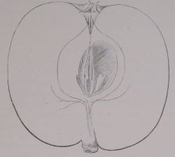 Beskrivelse af Frugten. — Størrelse og Form: godt middelstort, lidt afplattet rundt, Bugen snarest lidt over Midten, den ene Halvdel ubetydeligt stærkere udviklet. — Bæger: lukket, Bladene brede, korte, dunede, bøjer indad; Hulen flad eller næppe middeldyb, Ribber små, ret skarpe, ned over Frugten større; Tværsnit kantet. -- Stilk: kort, kraftig, glat, eller også en tyk Knort, trykket af en lille Svulst; Hulen flad eller næppe middeldyb, fuld af udflydende gulbrun Strålerust. -- Hud: lyst strågul med mere eller mindre lakrød Solside, hvori Spor af Flammer og Striber; Punkter talrige, fine med bred, mat Hov. Ingen Lugt, lidt fedtet. -- Kærnehus: lille, højtsiddende, Aksen middelvid, Rum ret store, svagt afrundede opad, rundt tilspidsede nedad, Vægge årede eller lidt filtet, sprængte, få store veludviklede lysebrune Kærner. — Bægerrør: en skarp Kegle, Tråde næsten dybtstillede, Griffel 2/3 kløvet, filtet på nederste Trediedel. —Kød: noget tæt af Bygning, saftfuldt, af forfriskende, lidt syrlig Vinsmag, lidt syrligere end Maglemers. — Modningstid : November, noget hen på Vinteren. — Værd: god Bordfrugt, meget smuk Salgsfrugt og meget god Husholdningsfrugt.