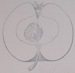 Beskrivelse af Frugten. Størrelse og Form: mlddelstort, lidt fladrundt, Bug på Midten, den ene Halvdel lidt stærkere udviklet. Bæger: åbent eller halvåbent, Bladene lange, bøjer først lidt indad, senere udad, er svagt uldede, støder sammen ved Grunden; Hulen middeldyb, middelvid til snæver, Ribber små, spores kun svagt ned over Frugten, Tværsnit omtrent rundt. Stilk: næsten lang, krum, brun, glat, kraftig; Hulen middeldyb, middelvid med lidt fin, brun Strålerust i Bunden. Hud: gullig hvid, meget af Frugten er omtrent dækket af et mørkt karmoisinrødt, hvori Stænk og Flammer; Punkter spredte, meget fine, brune med smal Hov, ses næsten ikke. Kraftig Lugt og stærkt fedtet. Kærnehus: fladrundt, løgformet, Aksen snæver, Rum store, svagt afrundede opad, rundt tilspidsede nedad, Vægge stærkt sprængte, én rundt ægformet, lysebrun Kærne i enkelte af dem. Bægerrør: en Kegle, undertiden lidt afstumpet, Tråde over midtstillede, Griffel 1/3 kløvet, svagt håret på den sammenvoksede Del. Kød: snehvidt med grønlige Årer, sødt vinagtigt med nogen Aroma og godt. Modningstid: Oktober midt i December. Værd: god Bordfrugt, meget smuk Salgsfrugt.