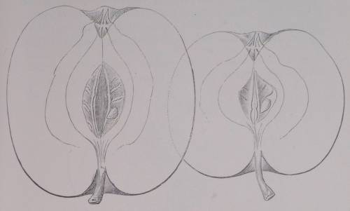 Beskrivelse af Frugten. —Størrelse og Form: middelstort, kort valseformet, bredt afstumpet ved begge Ender, Bugen på Midten, begge Halvdele éns udviklede. -Bæger: lille, lukket, Bladene korte, dunede, er oftest lidt adskilte ved Grunden; Hulen middeldyb, vid, Ribber rynkeagtige, taber sig hurtigt. -- Stilk: kort, tyk, dunet; Hulen middeldyb, snæver med lidt grå Strålerust. — Hud: hvidlig grøn, senere mere gul, omtrent helt dækket af et mørkt brunlig rødt, kun med svage Spor af Striber; Punkter spredte med smal Hov. Svag Lugt og svagt fedtet. -- Kærnehus: smalt, næsten ténformigt, Aksen snart vid, snart snæver, Rum smalle, tilspidsede mod begge Ender, Vægge sprængte, én rund, trind Kærne i hvert. — Kød: grønligt, saftigt, lidt marvet, forfriskende sødt vinagtigt, bliver hurtig brunt efter Snittet. — Modningstid: Februar—Forår eller til der kommer Frugt igen. —Værd: ret god Bordfrugt, meget god Køkkenfrugt, især til Kompot, i begge Tilfælde til Forårsbrug.
