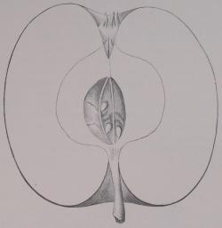 Beskrivelse af Frugten. — Størrelse og Form: stort til meget stort, de sendte Frugter var 90-91 mm brede, 85 mm høje, afplattet runde, snart højere, snart lavere, ofte tilsyneladende højere end brede, i Virkeligheden dog ikke, Bugen på Midten, éns aftagende og bredt afstumpede mod og ved begge Ender; den ene Halvdel oftest lidt stærkere udviklet. — Bæger: forholdsvis lille, lukket eller svagt åbent, Bladene små, grønne ved Grunden, bøjer indad, står så lige op, svagt dunede, lidt adskilte ved Grunden; Hulen dyb, middelvid, Ribber små indenfor Randen og rynkeagtige, på Randen flade, ofte med Spor af Søm, flade ned over Frugten; Tværsnit næppe helt rundt.— Stilk: middellang, kraftig til tyk, mørkebrun, fint dunet; Hulen dyb, middelvid til snæver, har ofte en Svulst, mangler omtrent Rust. —Hud: mørk citrongul, Solsiden og ofte mere er dækket af et mørkt blodrødt, hvori Spor af Flammer og Striber; Punkter lysebrune med bred Hov, men ses ikke i det røde. Ret kraftig Lugt, svagt fedtet. — Kærnehus: rundt løgformet med fremtrædende grønne Biårer, Aksen vid, Rum små og smalle, vidtåbne, tilspidsede mod begge Ender, Vægge sprængte, lidt filtede, Kærner små, runde, trinde, talrige. — Bægerrør: en smal, dyb Kegle, Tråde lidt under midtstillede, Griffel lang, tynd, dybtkløvet, fint dunet over det hele. —Kød: hvidt, grønligt næst Huden, grønlige Årer, lidt groft, marvet, ret saftigt, af sød vinagtig, noget kalmusagtig krydret Smag. — Modningstid: Januar til hen på Foråret. —Værd: ret god Bordfrugt, udmærket Handels- og Køkkenfrugt.